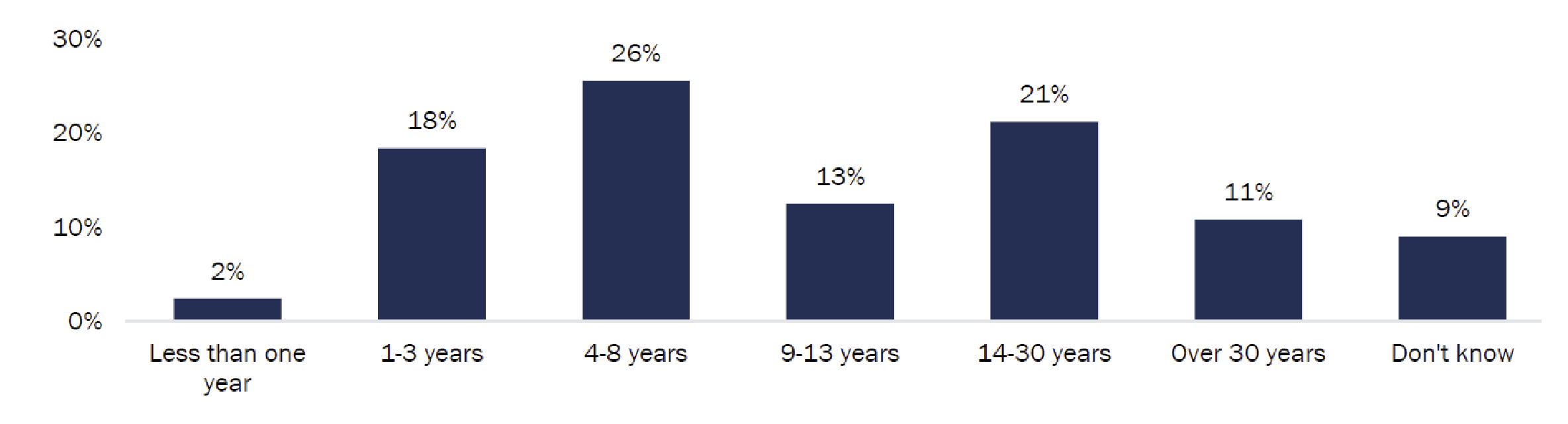 Surveyed contractors estimated the installation of a unitary HPWH system serving single-family residential, low-rise multifamily, or in-unit multifamily properties to take two days on average, although contractor responses ranged from one to 13 days (n=52). Similarly, on average, contractors said an installation of a larger, centralized system would take two days; one respondent noted it would take up to five days (n=8).[21]