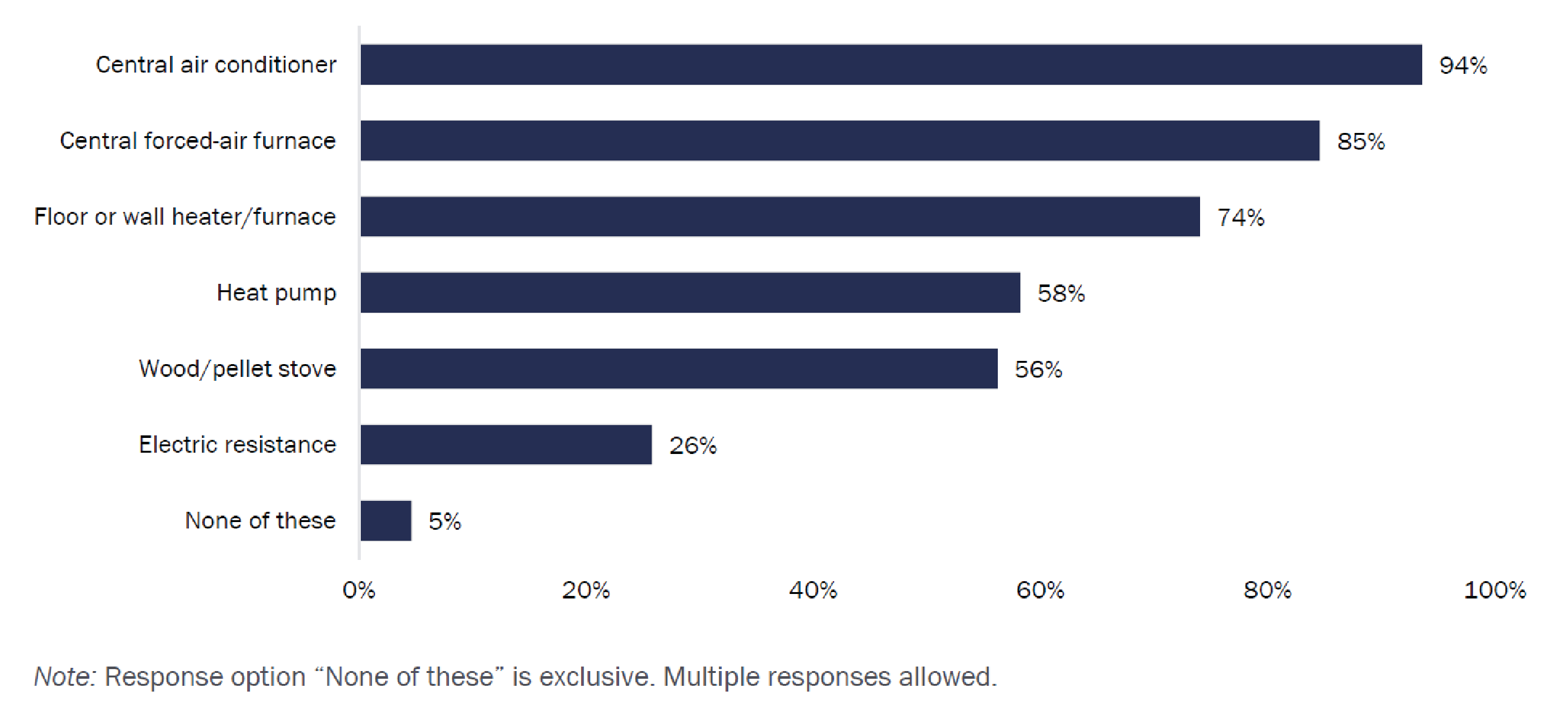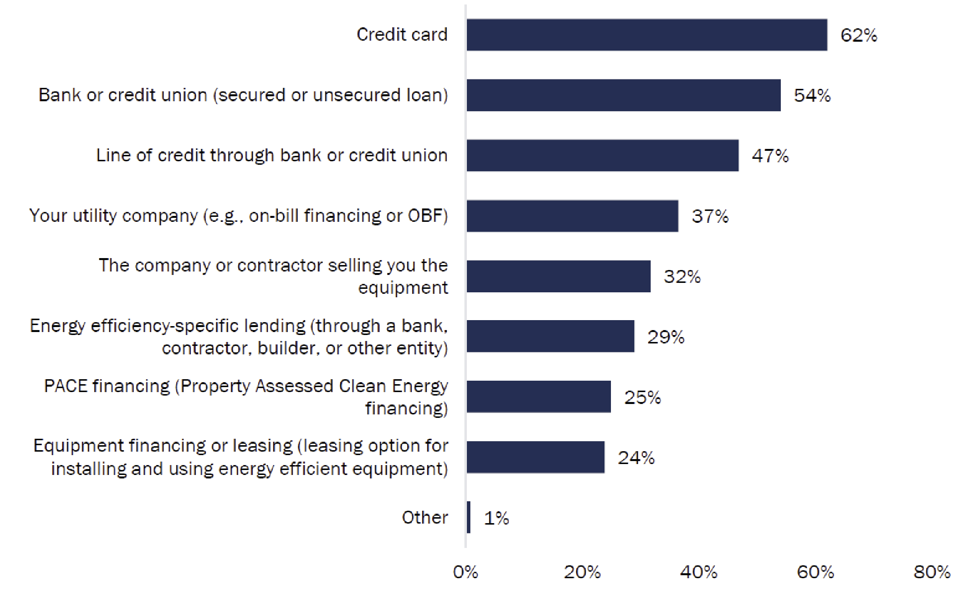 - Nearly half (232 of 500; 46%) of homeowner respondents were unaware of financing options available to them to purchase new space heating/cooling or water-heating equipment, while another 17% (86 of 500) were unsure whether they knew about these options. Homeowners were most likely to be aware of general financing options, such as a credit card or a loan through a banking institution.