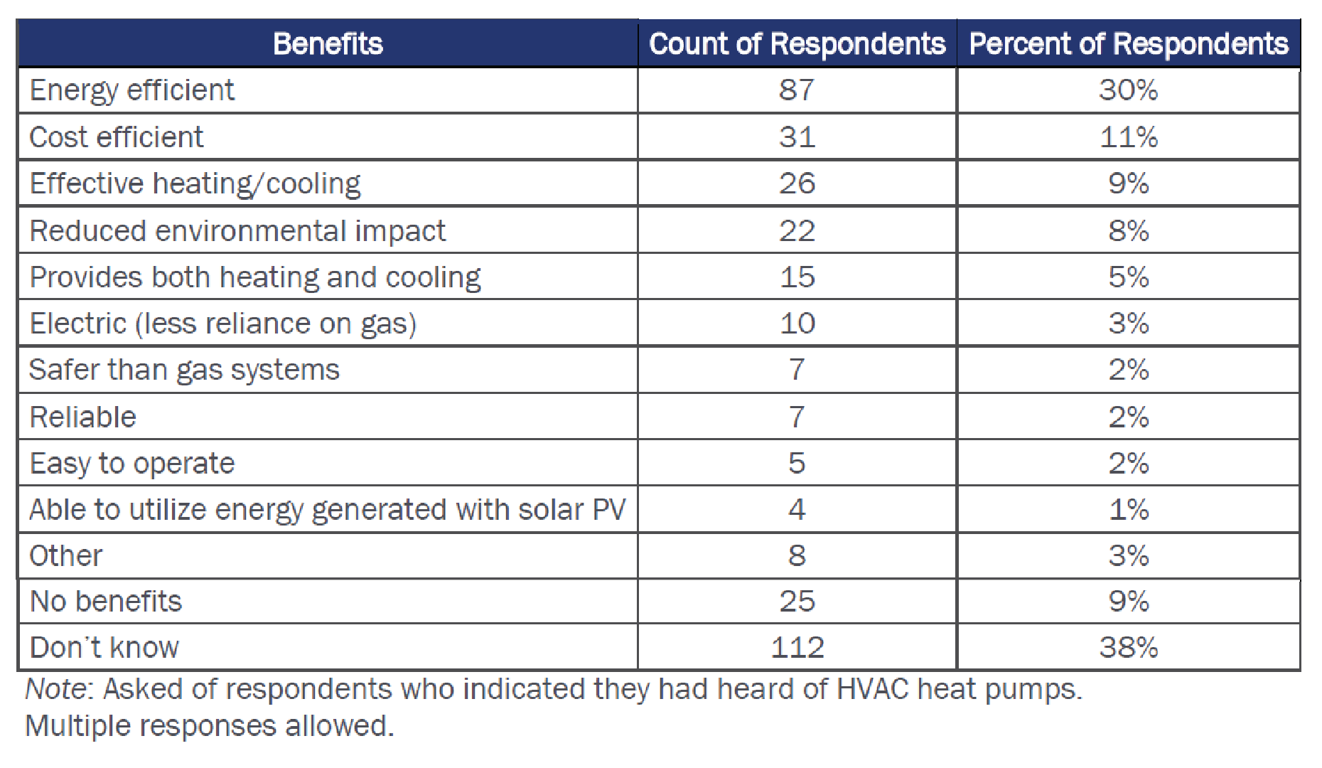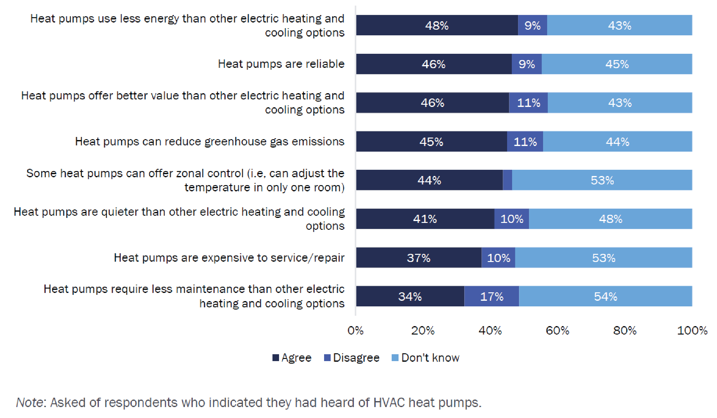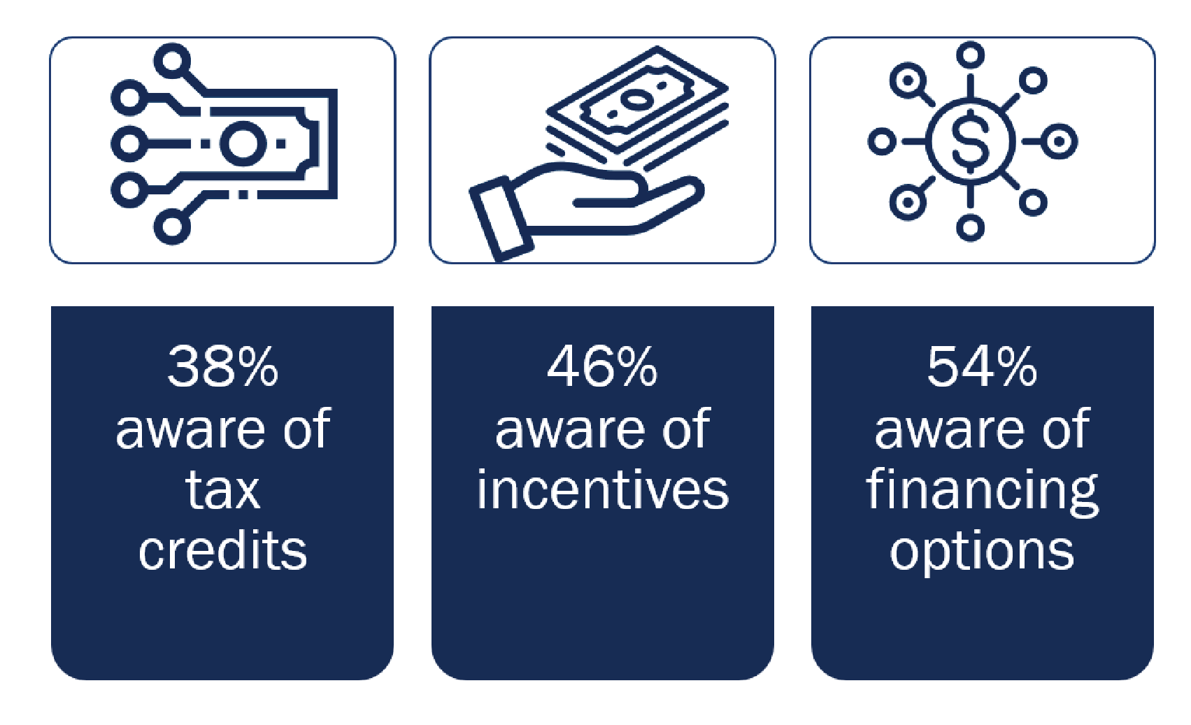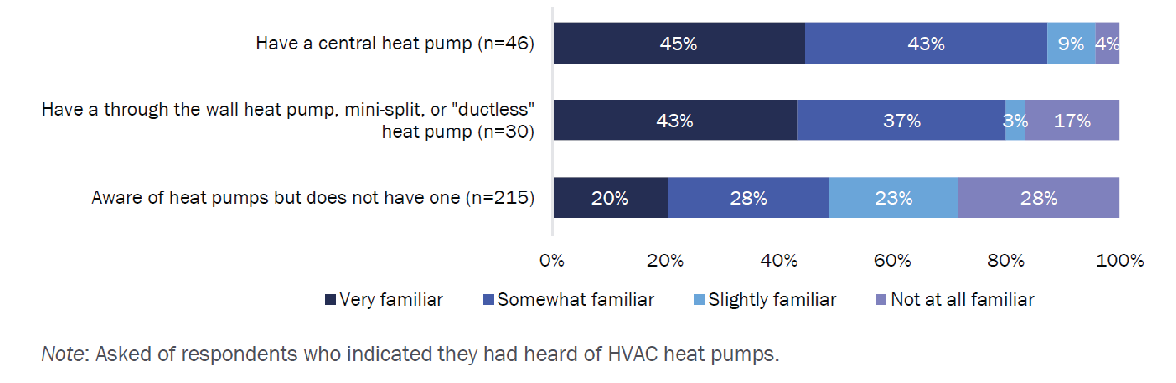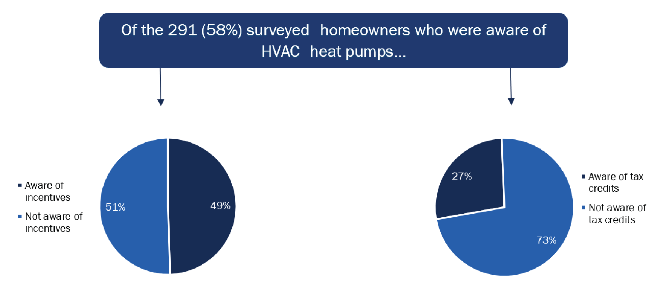 - While just over half of homeowners were aware of some type of financing option (54%), just under half (46%) knew about incentives, and 38% were aware of tax credits for heat pump purchases.