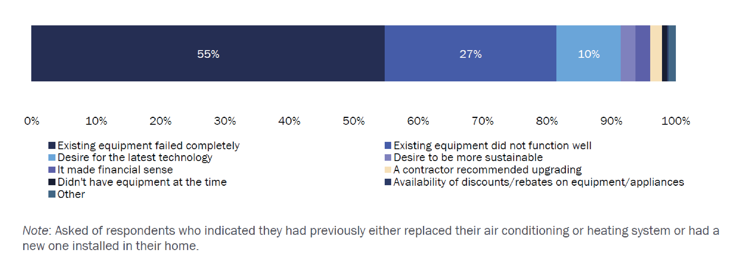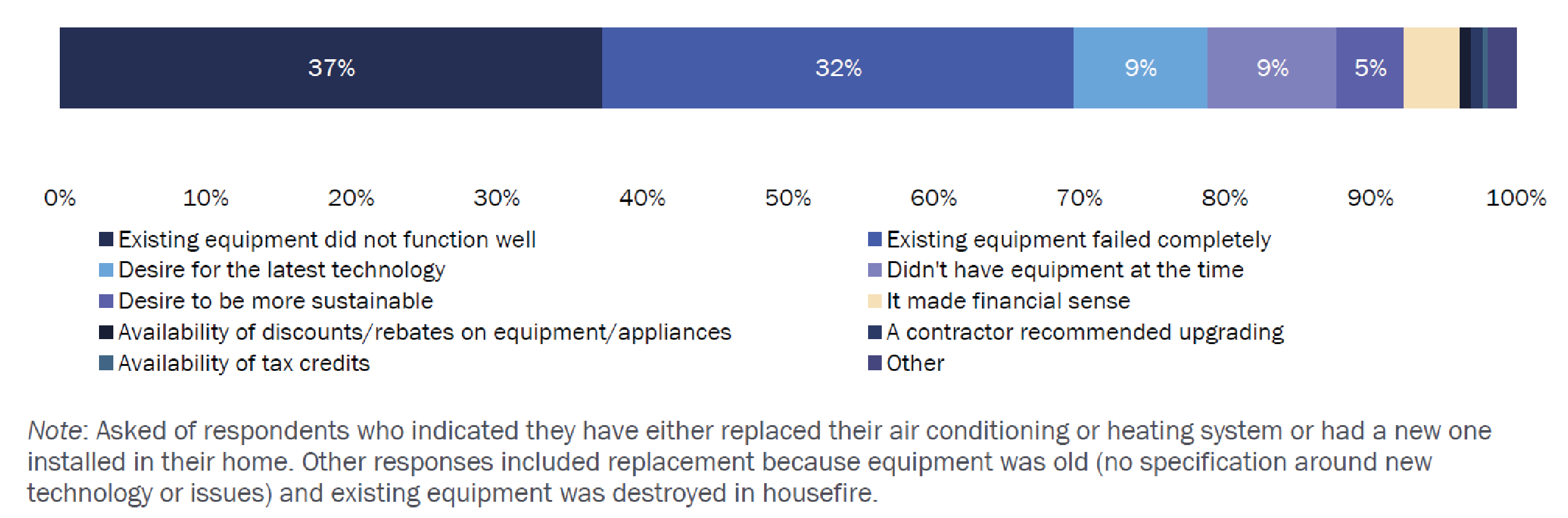 - Homeowners are more likely to replace their HVAC systems when they are not functioning well or broken compared to those choosing to update functioning equipment. Of respondents who had ever replaced their HVAC system, over two-thirds (181 of 261; 69%), said their prior equipment was not functioning properly (37%) or failed completely (32%), the same proportion observed at baseline.