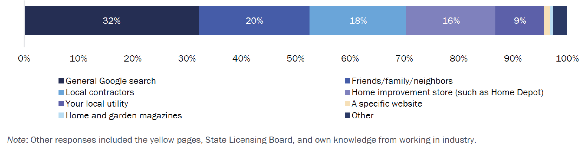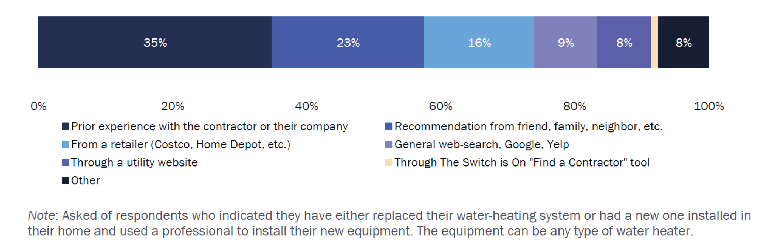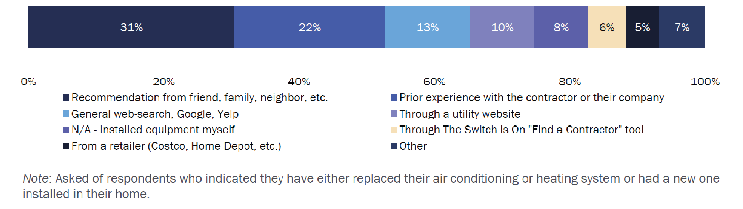 - The most common way respondents (137 of 258; 53%) found their contractor was through a personal referral or prior experience with them or their company. Nearly a third (29%) of surveyed homeowners found their contractor online, either through a general web search such as Google or Yelp, their utility’s website, or by using The Switch is On “Find a Contractor” tool.