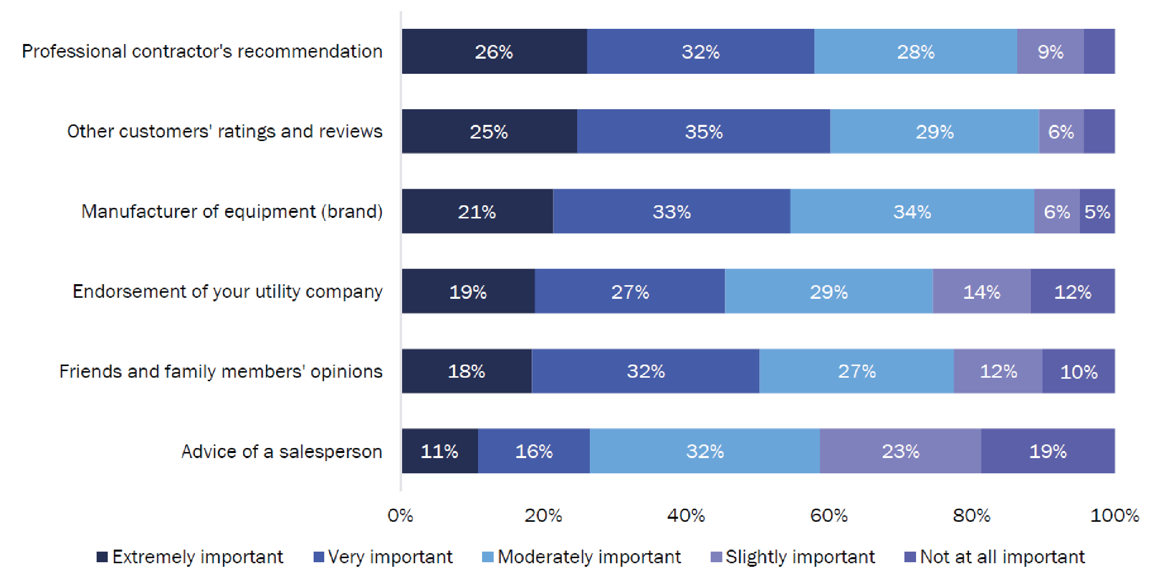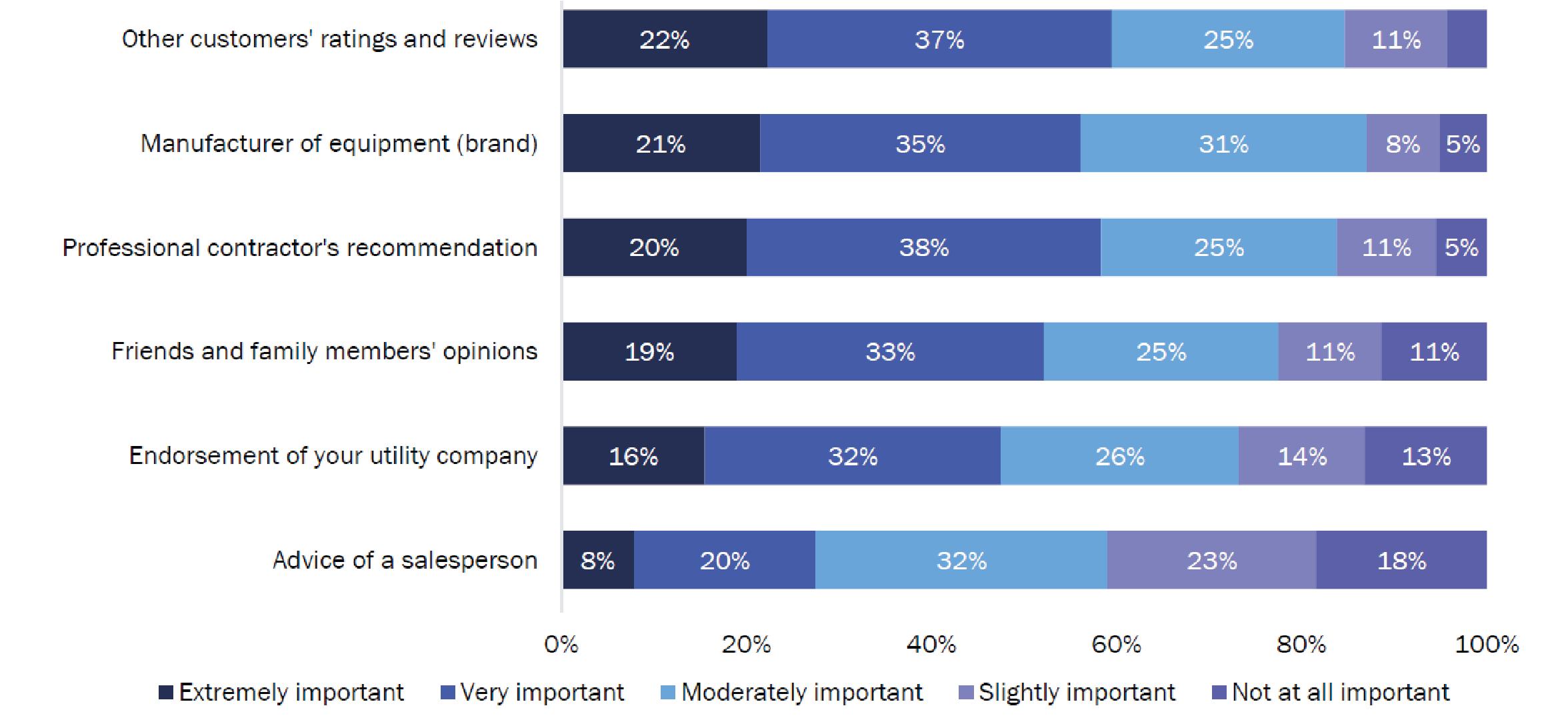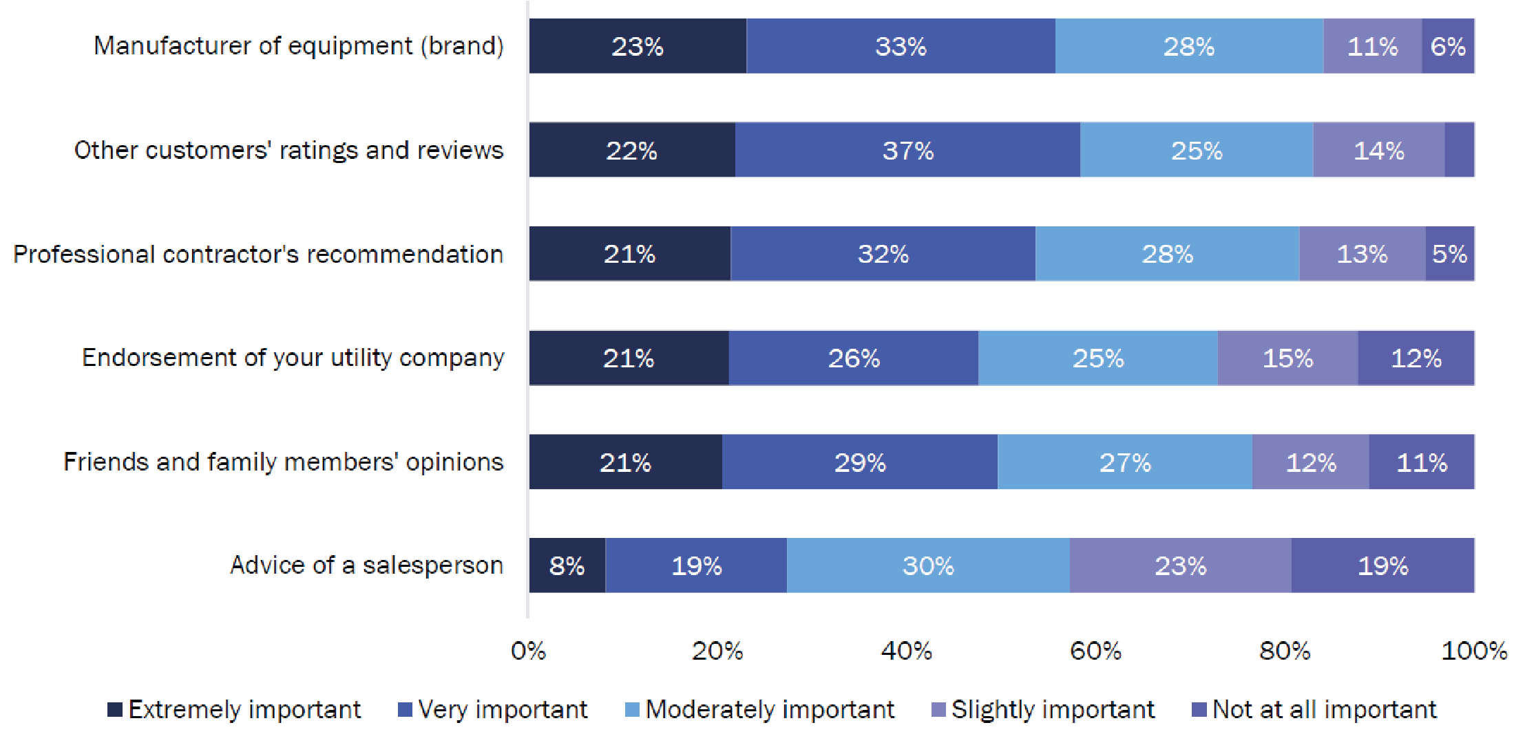 We also asked respondents how important a variety of sources would be in influencing their decision about a new water-heating system. The equipment manufacturer and other customers’ reviews were the top two most influential sources, though nearly all sources we asked about were rated similarly (Figure 38). Both of these top two sources were also those rated as most important to respondents in the baseline survey. Similar to both space heating and cooling equipment, when considering new water-heating equipment, the advice of a salesperson was rated least important to surveyed homeowners, with over two-fifths (214 of 500; 43%) rating it as slightly or not at all important to them (same as baseline).