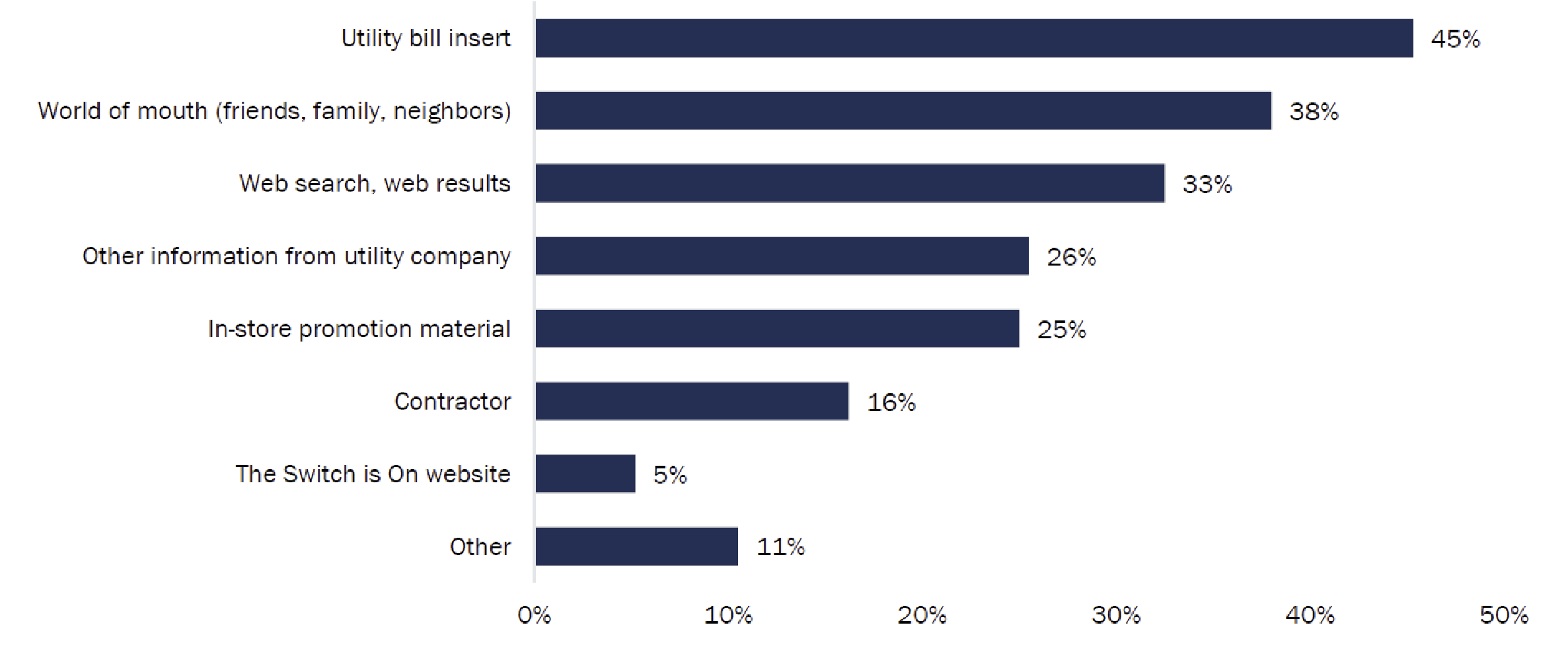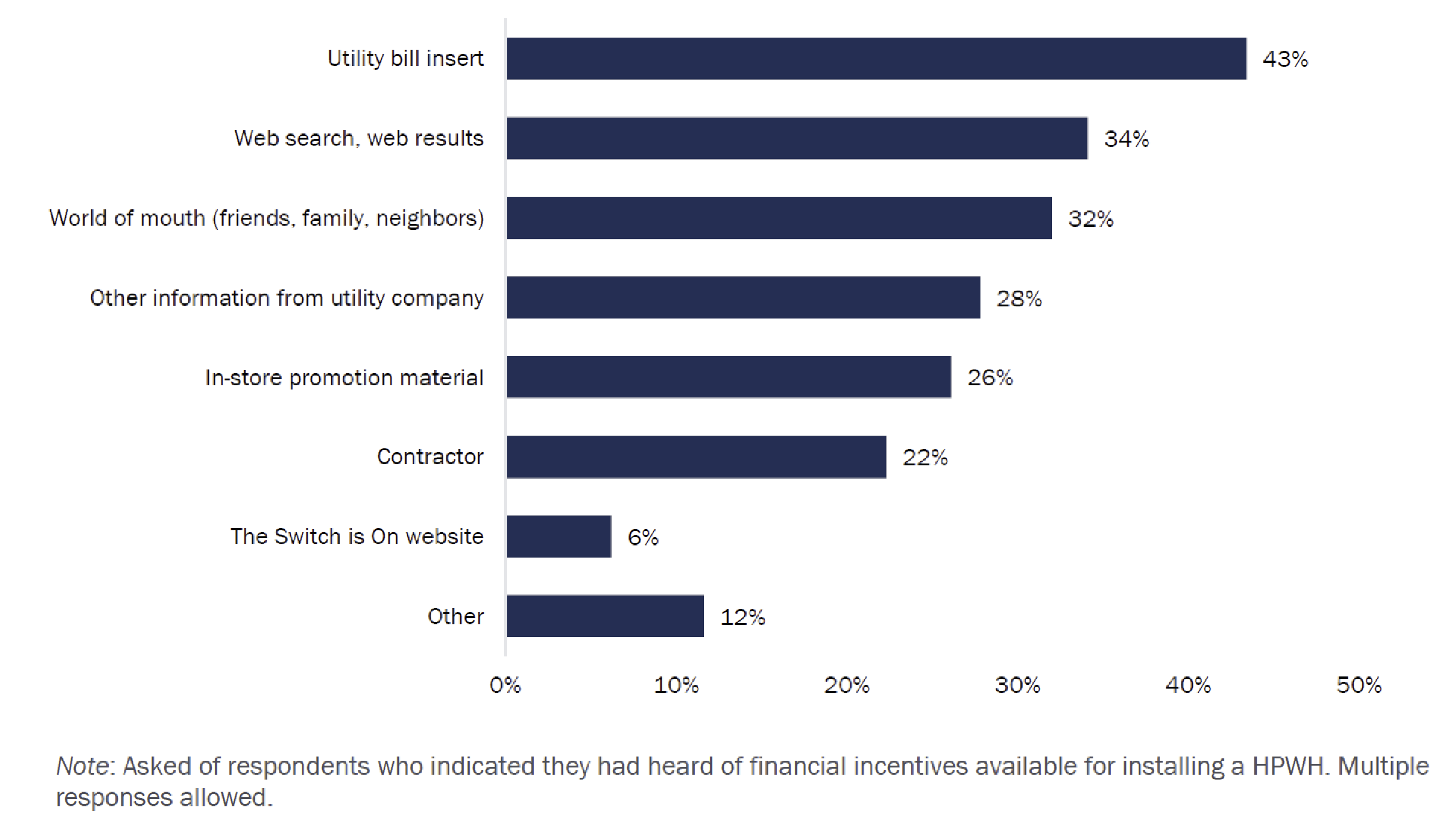 We asked homeowners who indicated they were aware of HPWHs if they were aware of financial incentives some organizations offer for installing a HPWH. Nearly half of these respondents (90 of 196; 46%) reported they were aware of the incentive offerings, a 6% increase since last year. The most common ways respondents heard about the availability of HPWH incentives was through their utility bill inserts (39 of 90; 43%, 19% increase from baseline), a web search (31 of 90; 34%, 4% increase from baseline), and word of mouth (29 of 90; 32%, five percent increase from baseline); the same three top sources respondents reported hearing about incentives for installing an HVAC heat pump (Figure 39).