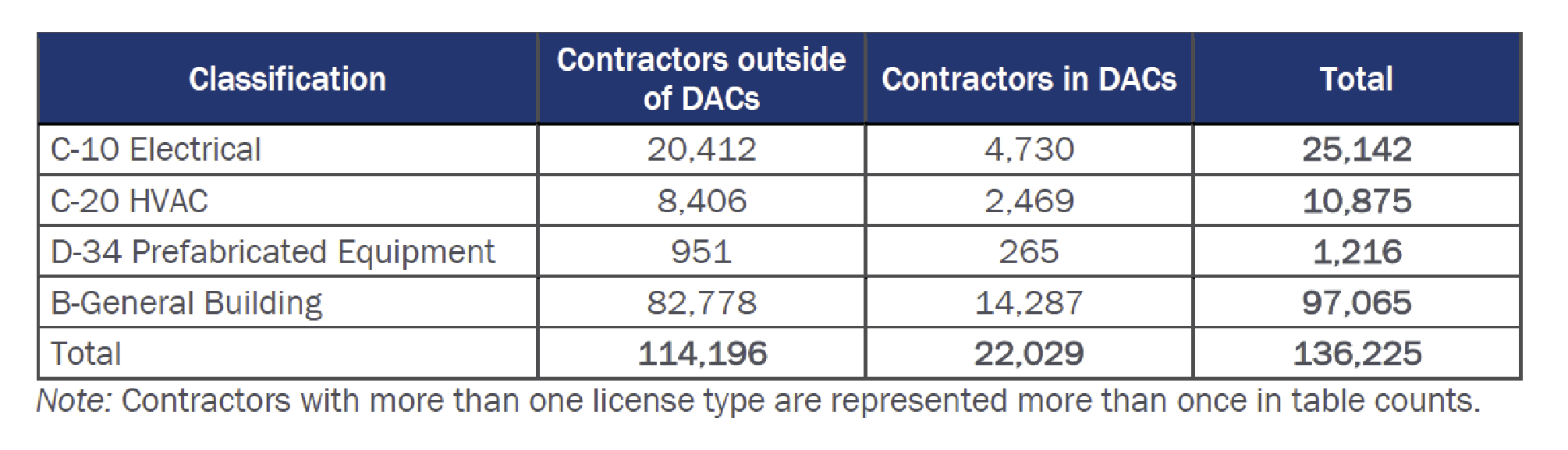 There were 15,746 contractors in California with a C-36 Plumbing license in 2023, per the CSLB; 3,230 of those were in DACs. There were 10,875 C20-HVAC contractors in California in 2023 and 2,469 of those were in DACs. Manufacturers and distributors have anecdotally estimated that at least half of residential water heaters are installed by handymen as opposed to licensed contractors.