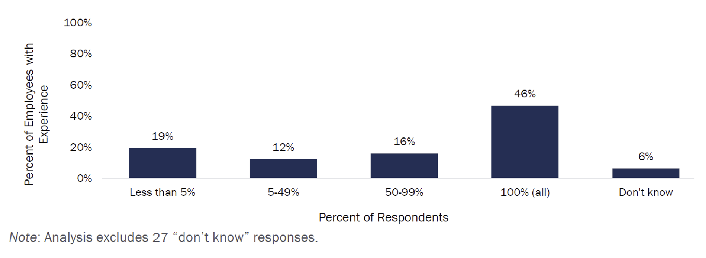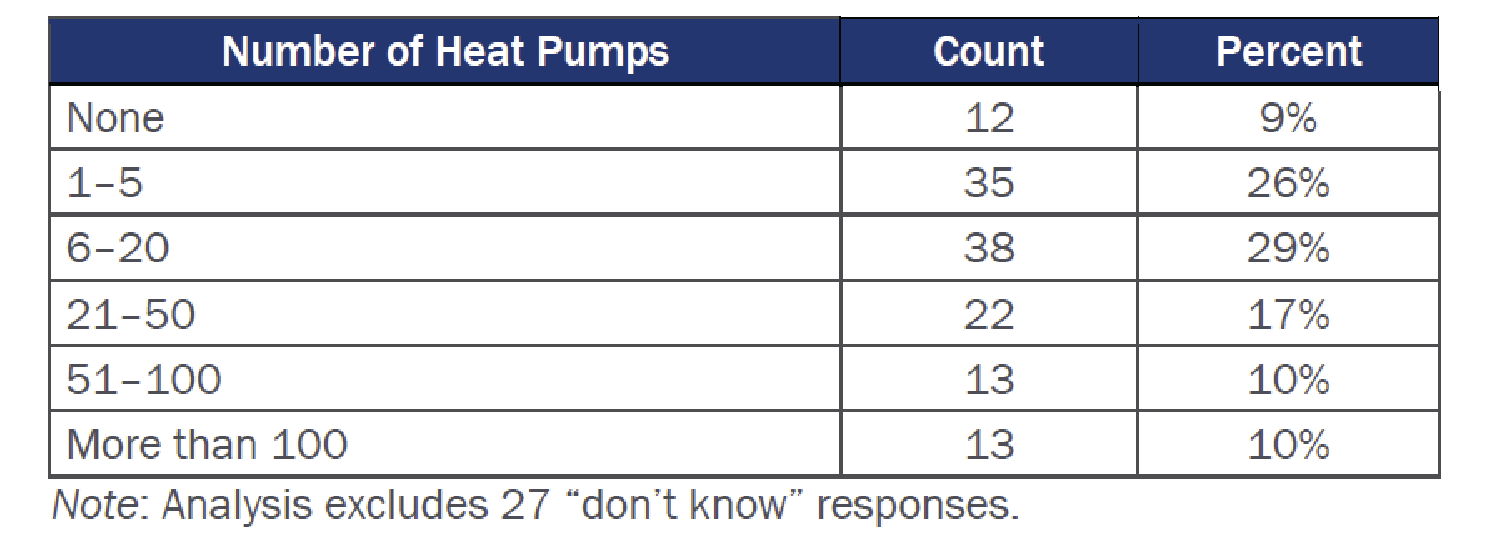 - Most contractors (71 of 114; 62%) said at least 50% of their staff have installed or worked on HVAC heat pumps in the past year. Almost half of respondents (53 of 114; 46%) said that all their staff had experience working with heat pumps in the past year.[3] These findings are from contractor firms with two or more employees.