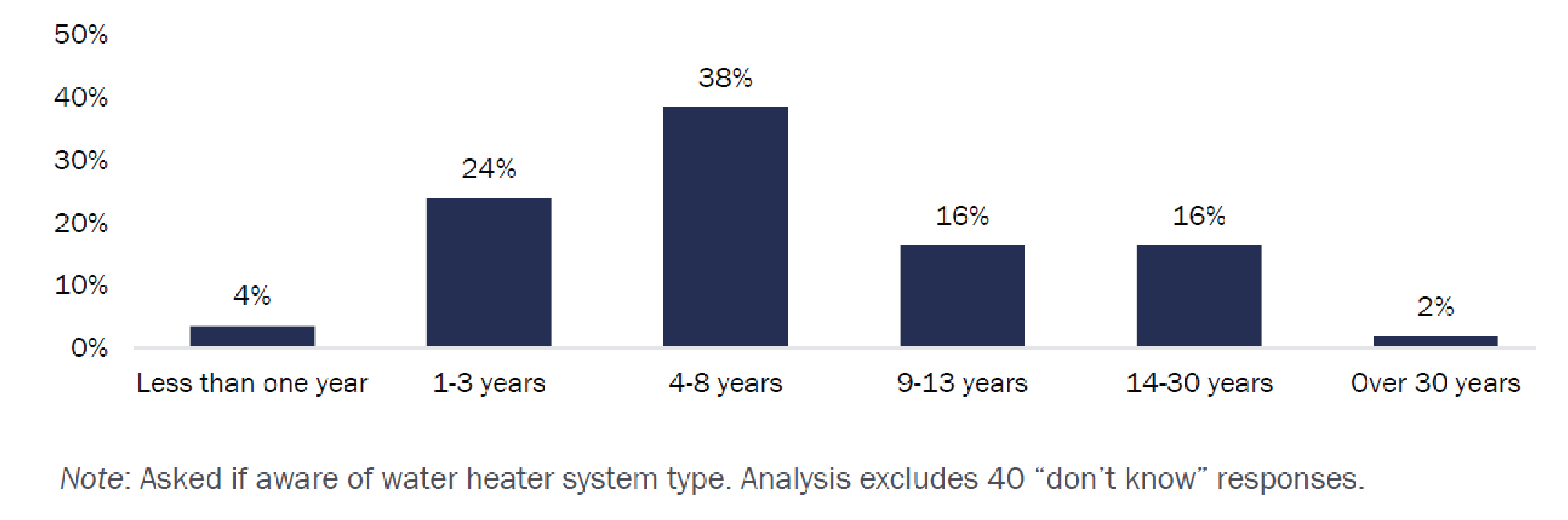 - The average age of homeowner respondents’ gas water heaters were older than the electric water heaters. More than one-third (126 of 354; 36%) of gas water heaters were nine years or older, indicating a significant proportion of California’s water heaters will likely need to be replaced in the next few years.[5]