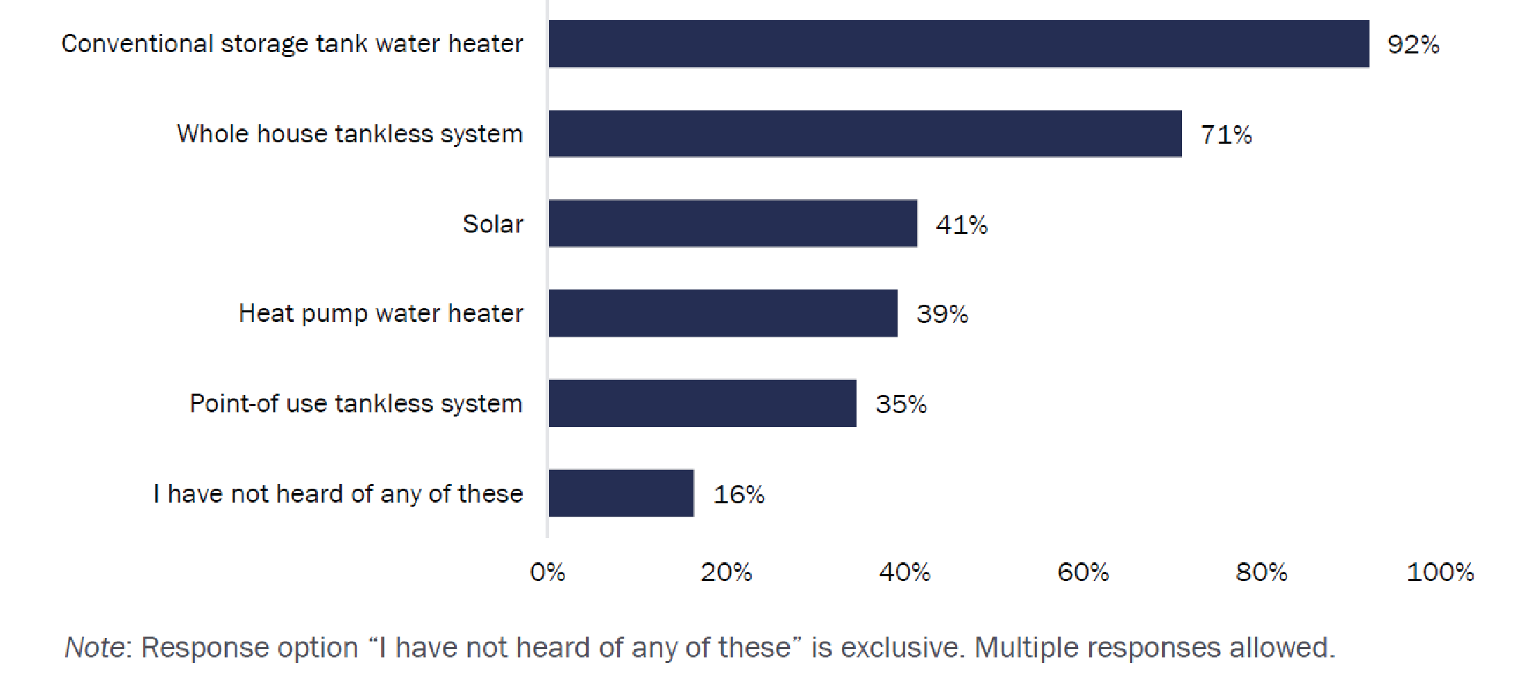 Given the newly available tax credits for HPWHs, we also asked those who were aware of HPWHs if they knew they may be eligible for up to a $2,000 tax credit from the federal government for purchasing a HPWH. More than a third (74 of 196; 38%) of these respondents said they were aware of their eligibility.