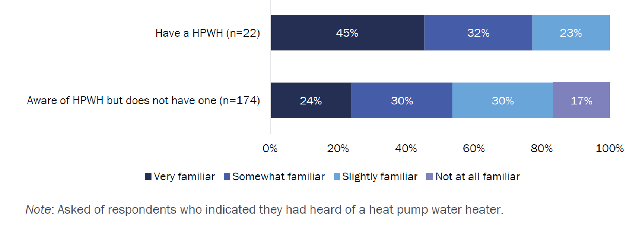 - Of the 196 respondents who were aware of HPWHs, more than half (111 of 196; 57%) were very or somewhat familiar with the equipment (7% increase from baseline).