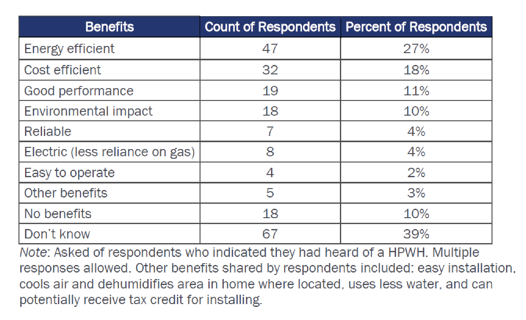 - Among respondents who had heard of a HPWH, 39% reported that they did not know what benefits they offered. This figure represents a 44% decrease from baseline, where 83% said they did not know, and suggests a large increase in homeowner knowledge about HPWH equipment.