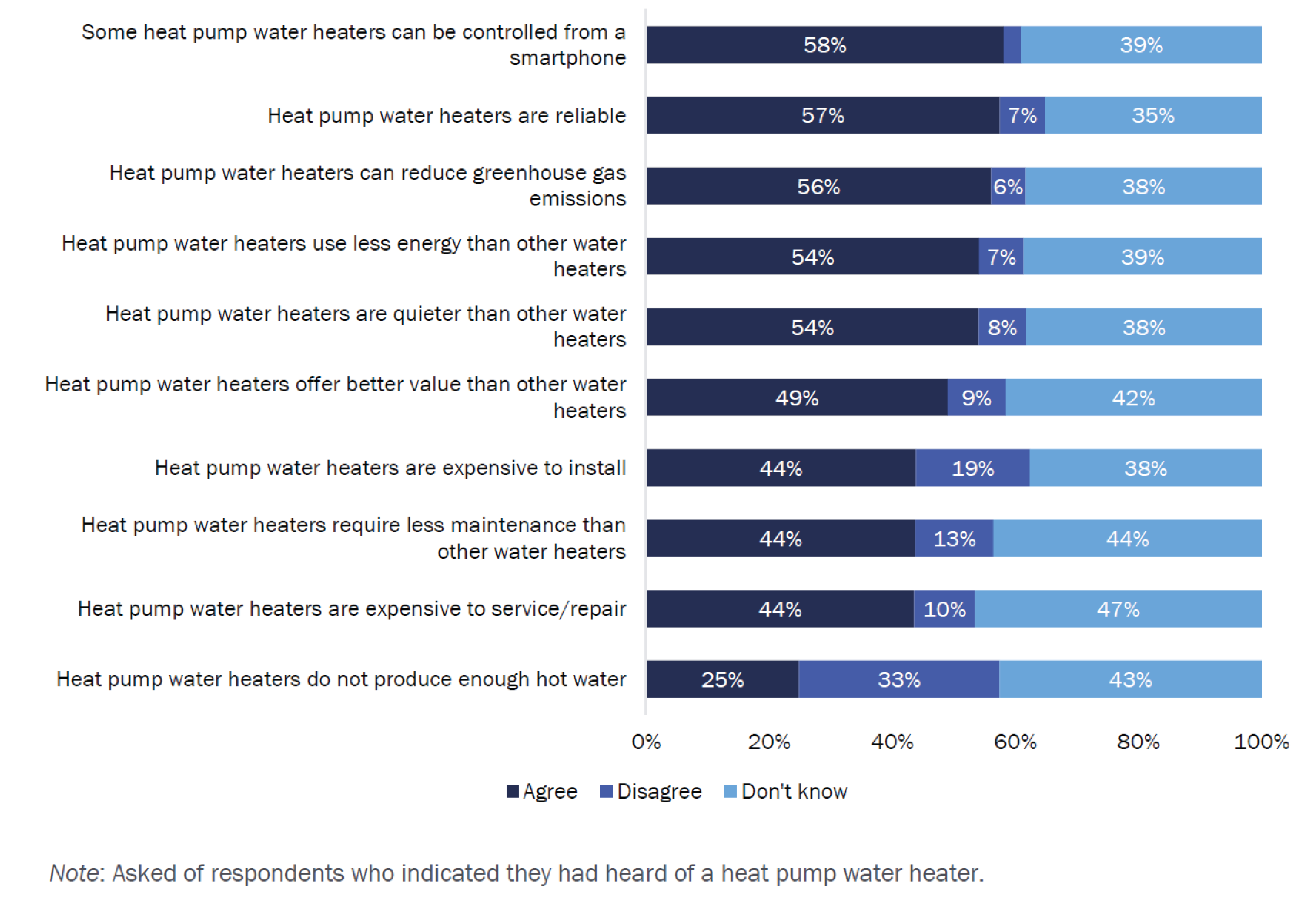 There were conflicting responses for whether a HPWH was expensive to install, with 44% agreeing they are expensive and 19% disagreeing. For the statement, “Heat pump water heaters do not produce enough hot water, a greater proportion of respondents disagreed (33%) than agreed (25%), suggesting more respondents believe HPWHs are able to meet hot water needs.