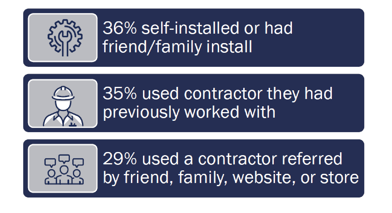 - Like we saw with HVAC systems, most homeowners who had installed a new water-heating system at some point in their home did so because the equipment either failed completely (166 of 304; 55%) or did not function properly (81 of 304; 27%). Ten percent or less reported replacing their water heater for reasons other than the functionality of the equipment. Just over one-third installed the water heater themselves or used a friend or family member; just over one-third used a contractor they previously worked with; while just under one-third used a contractor referred to them by a friend, family member, website, or store.