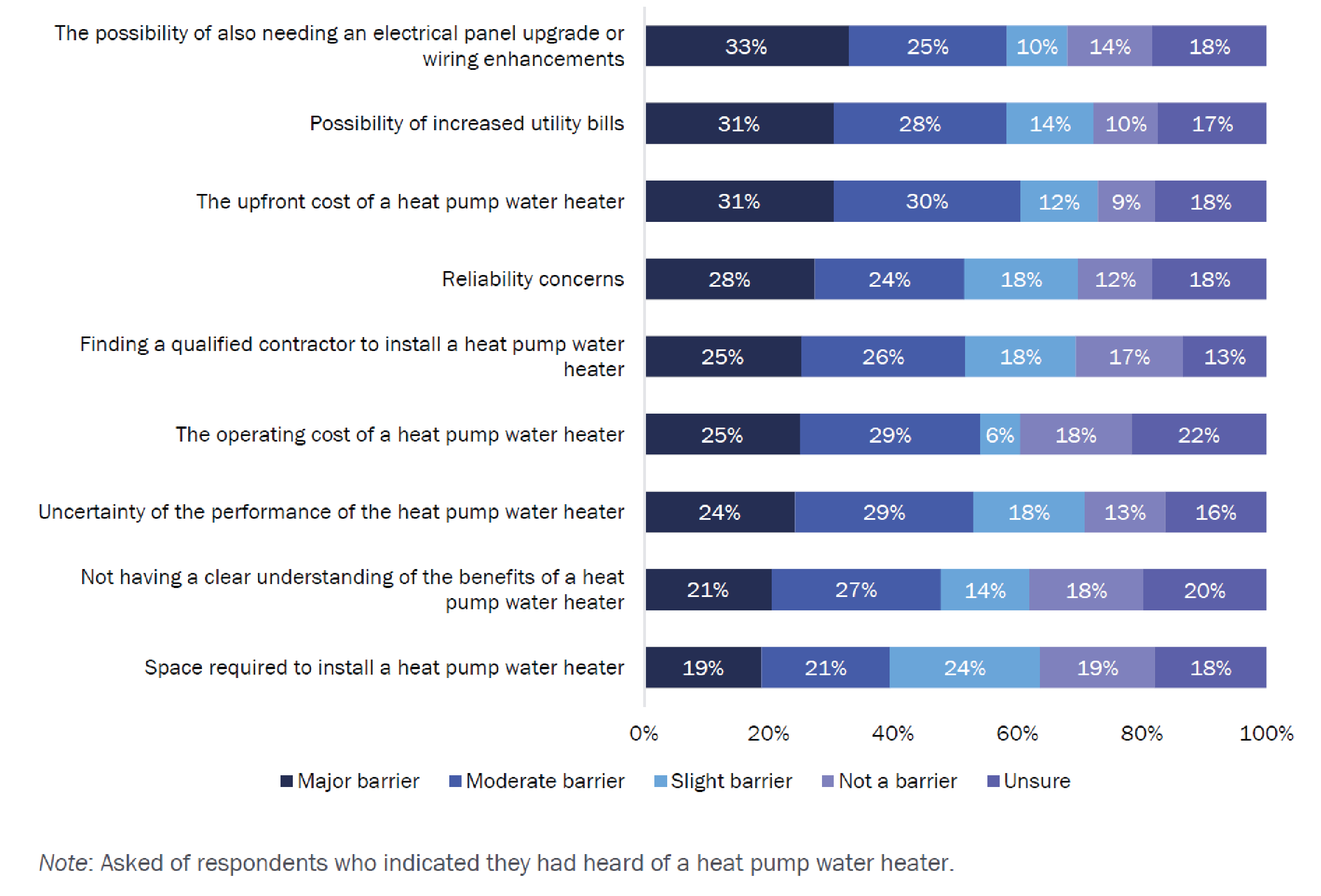 - Similar to an HVAC heat pump, respondents’ largest concerns with purchasing a HPWH were the associated costs and the possibility of additional home upgrade requirements. Respondents most commonly identified the possibility of needing an electrical panel upgrade or wiring enhancement, the possibility of increased utility bills, and higher upfront cost of equipment as top barriers for them if they were to consider purchasing a HPWH.