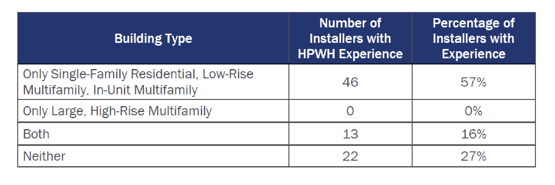 Surveyed contractors had more experience with unitary HPWH installations in single-family or in-unit multifamily properties compared to centralized systems in large multifamily properties (among those for whom at least 50% of their business came from installation jobs; Table 14). As observed at baseline, over a quarter (13 of 81; 27%) of survey respondents whose firms sell water-heating equipment and who attributed at least half of their business to water-heating installation jobs had no HPWH experience.