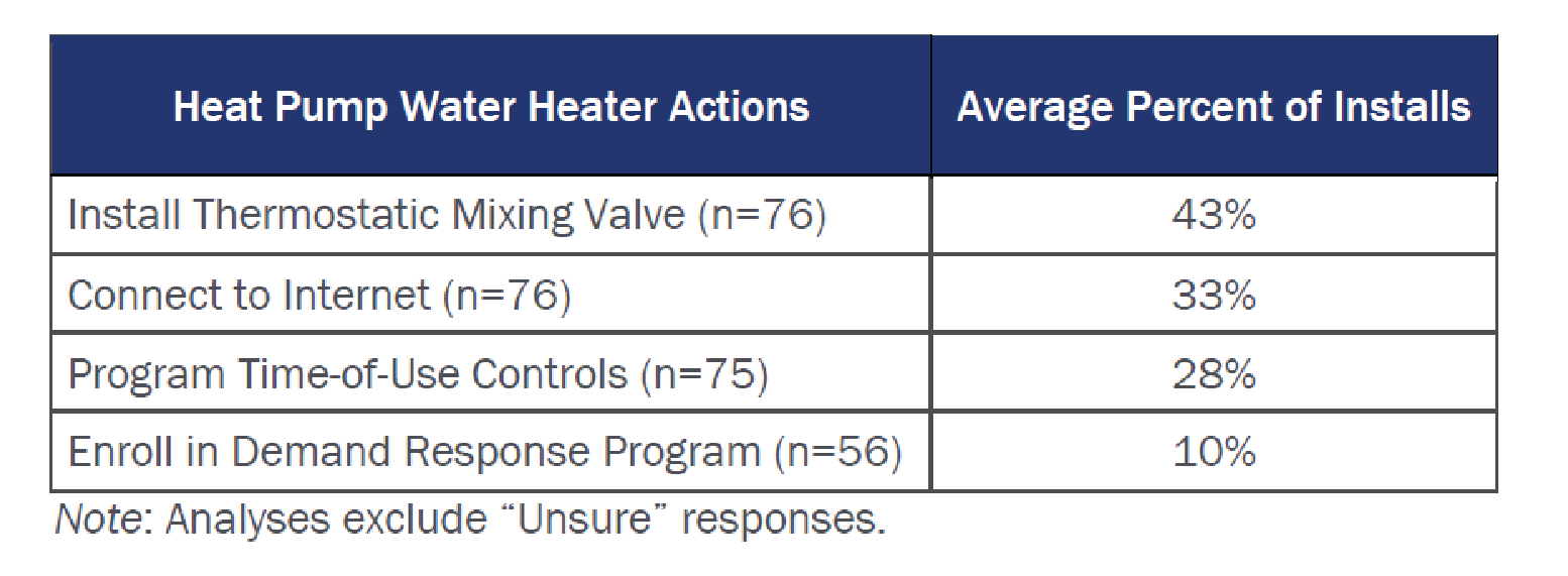 - HPWH contractors reported that, on average, 43% of their HPWH installations include a thermostatic mixing valve (TMV), 33% are connected to the Internet, 28% are programmed with TOU controls, and 10% enrolled a customer in a demand response program. Almost one-third of HPWH contractors reported they were unsure or did not know what a demand response program was, suggesting the need for education on this topic with plumbers.