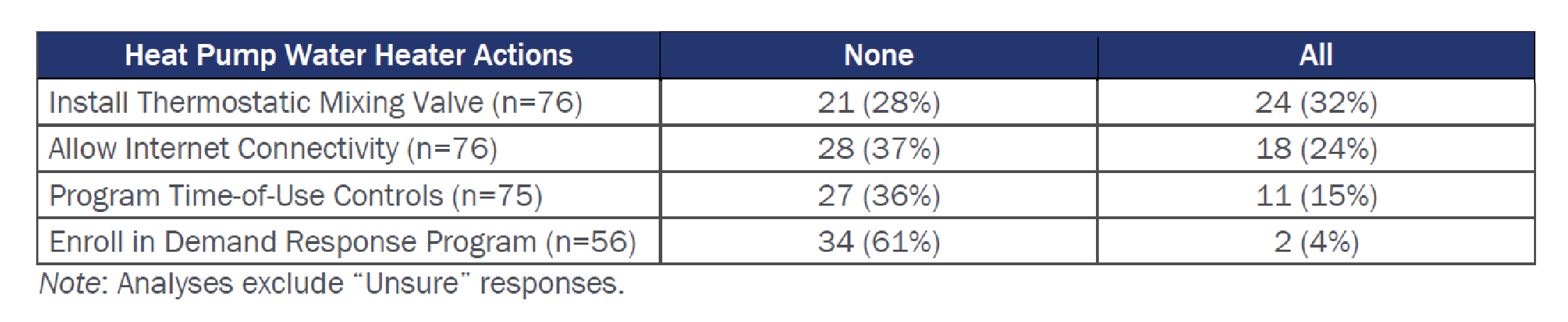 [20] Averages exclude “Unsure” responses. Since baseline, the average reported percentage of HPWH installations that included a 1) thermostatic mixing valve, increased by 1%; 2) connectivity, decreased by 5%; and 3) Time-of-Use controls, remained the same. Enrollment in a demand response program was not asked in the baseline survey.