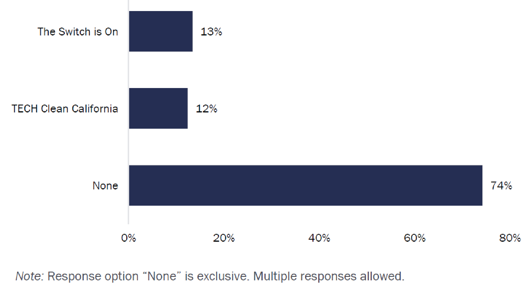 We wanted to know whether our homeowner survey respondents had heard of the TECH Clean California Initiative or The Switch is On website, which is designed to educate homeowners about home electrification. While most were unaware of both, a similar number had heard of The Switch is On and TECH Clean California (Figure 45). The Switch is On website and the TECH Clean California Initiative had been in the marketplace for about one year at the time of the survey.