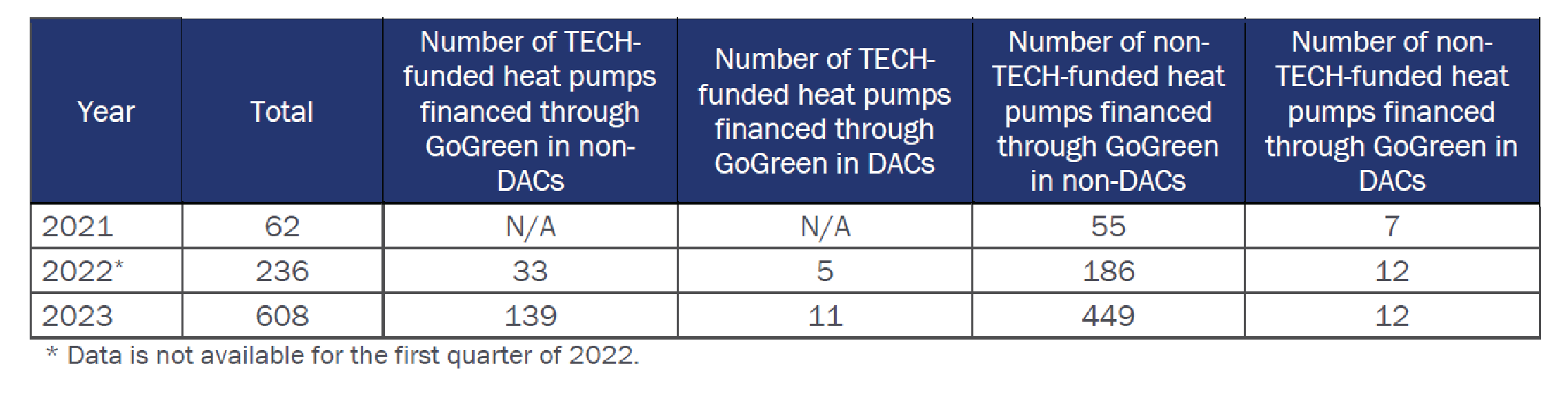 As shown in Table 19, there has been an annual increase in the number of heat pump projects financed through the GoGreen program (either funded through TECH or through other GoGreen funding sources), but few of these were financed in DACs. The number of heat pump projects financed through GoGreen in 2021 (n=62) increased to 608 in 2023.