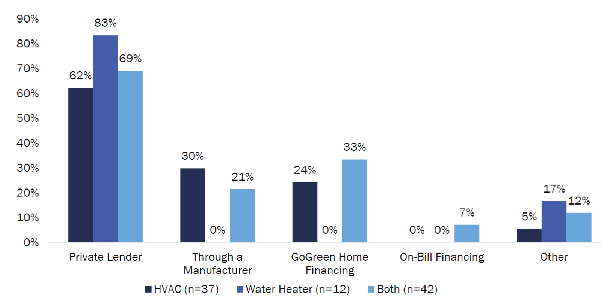 - Heat pump customers most frequently utilized financing when purchasing equipment from a contractor who worked with both HVAC and water-heating equipment. Almost a third of contractors who worked with both HVAC and water-heating equipment and offer financing options (7 of 24; 29%) said 50% or more of their customers used financing to purchase their heat pump.