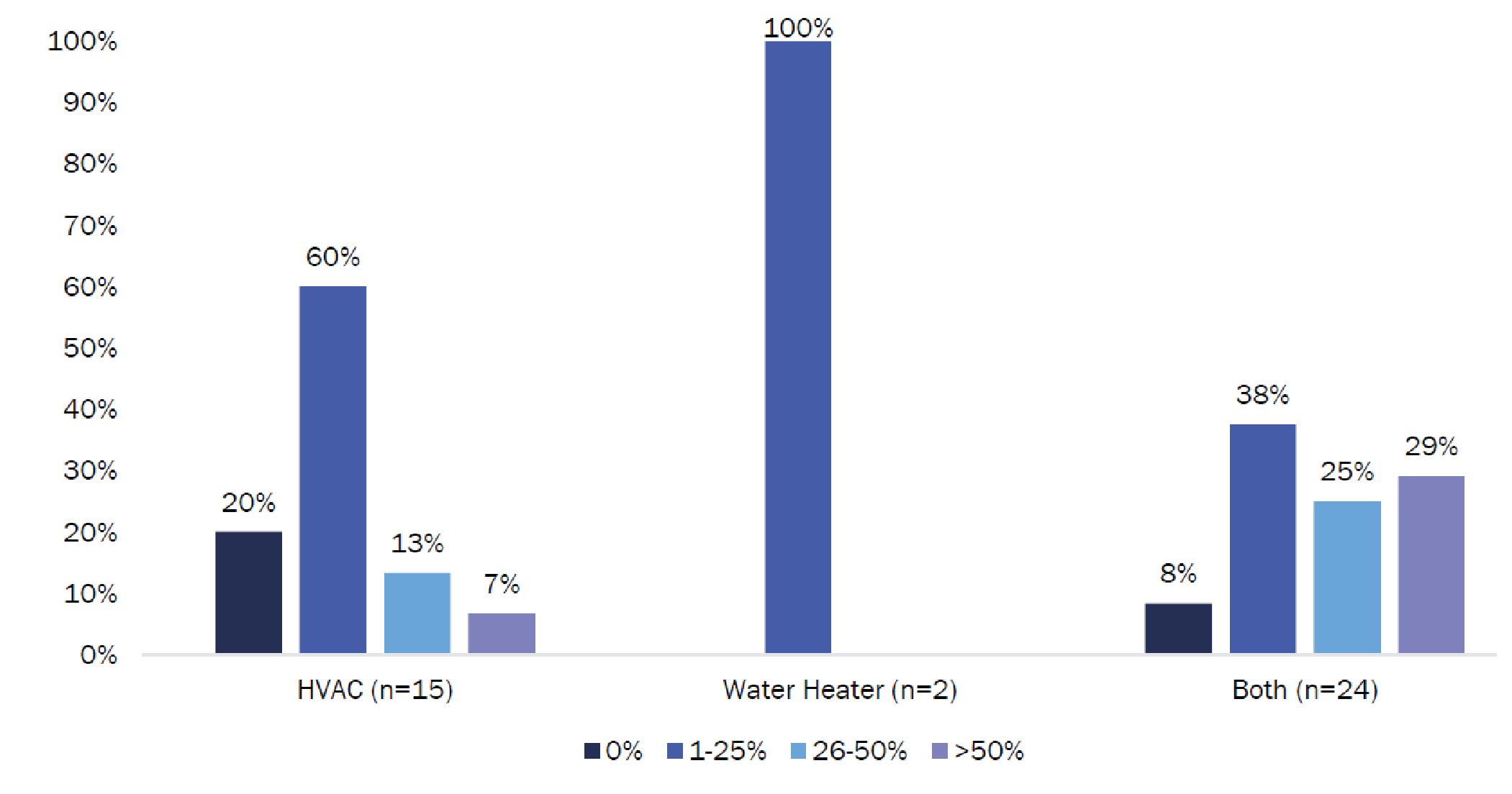 Heat pump customers most frequently utilized financing when purchasing equipment from a contractor who worked with both HVAC and water-heating equipment (Figure 47). Almost a third of contractors who worked with both HVAC and water-heating equipment and offer financing options (7 of 24; 29%) said 50% or more of their customers used financing to purchase their heat pump. Fewer customers used financing when working with a contractor who specialized in only one type of equipment, most of these contractors said 25% or fewer customers used financing to purchase their heat pump.