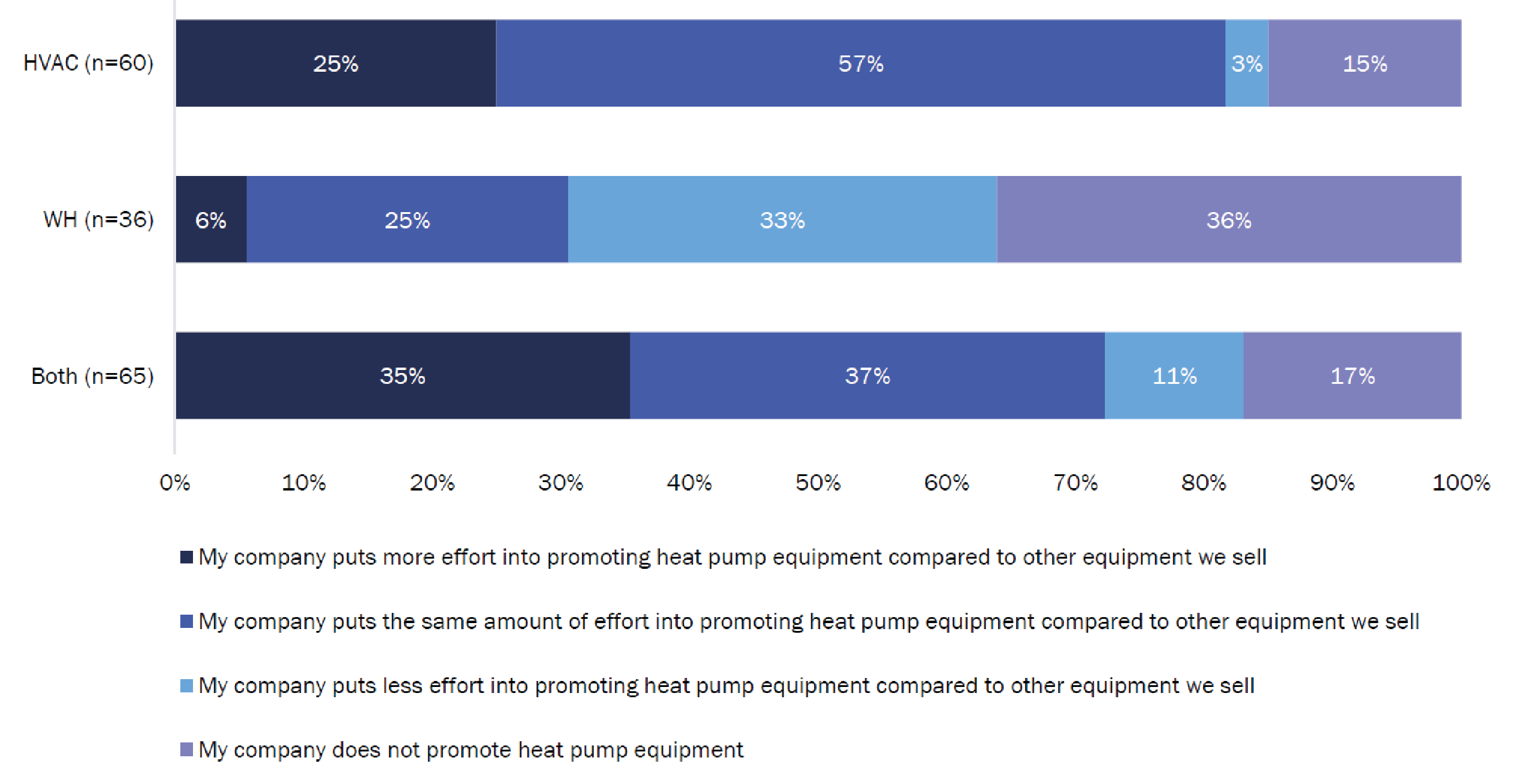 - Most firms that sell HVAC equipment promote heat pumps, while water-heating contractors were least likely to promote them; more than two-thirds said their company puts minimal to no effort into heat pump promotions. . Firms that provide both HVAC and water-heating services were most likely to promote heat pumps above and beyond other equipment options.