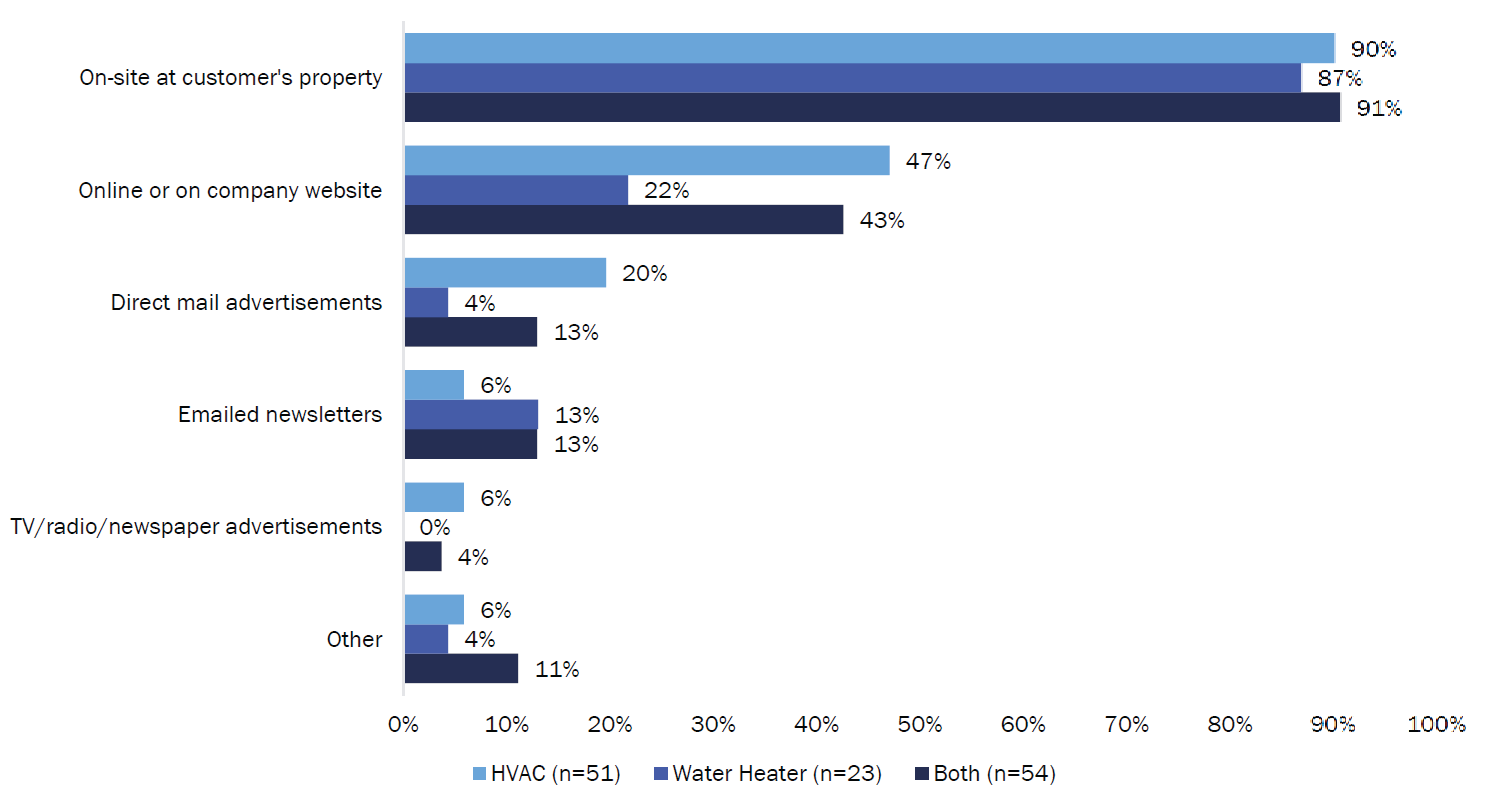 Regardless of the type of equipment they work with, surveyed contractors’ companies most commonly promote heat pumps while on-site at a customer’s property (Figure 51). The other two common channels contractors use to promote heat pumps were online sources or direct mail inserts, while the least common channels were TV, radio, or newspaper advertisements. Other ways contractors mentioned their company promotes heat pumps included word of mouth (five mentions), through incentive programs (two mentions), social media (one mention), and billboards (one mention).