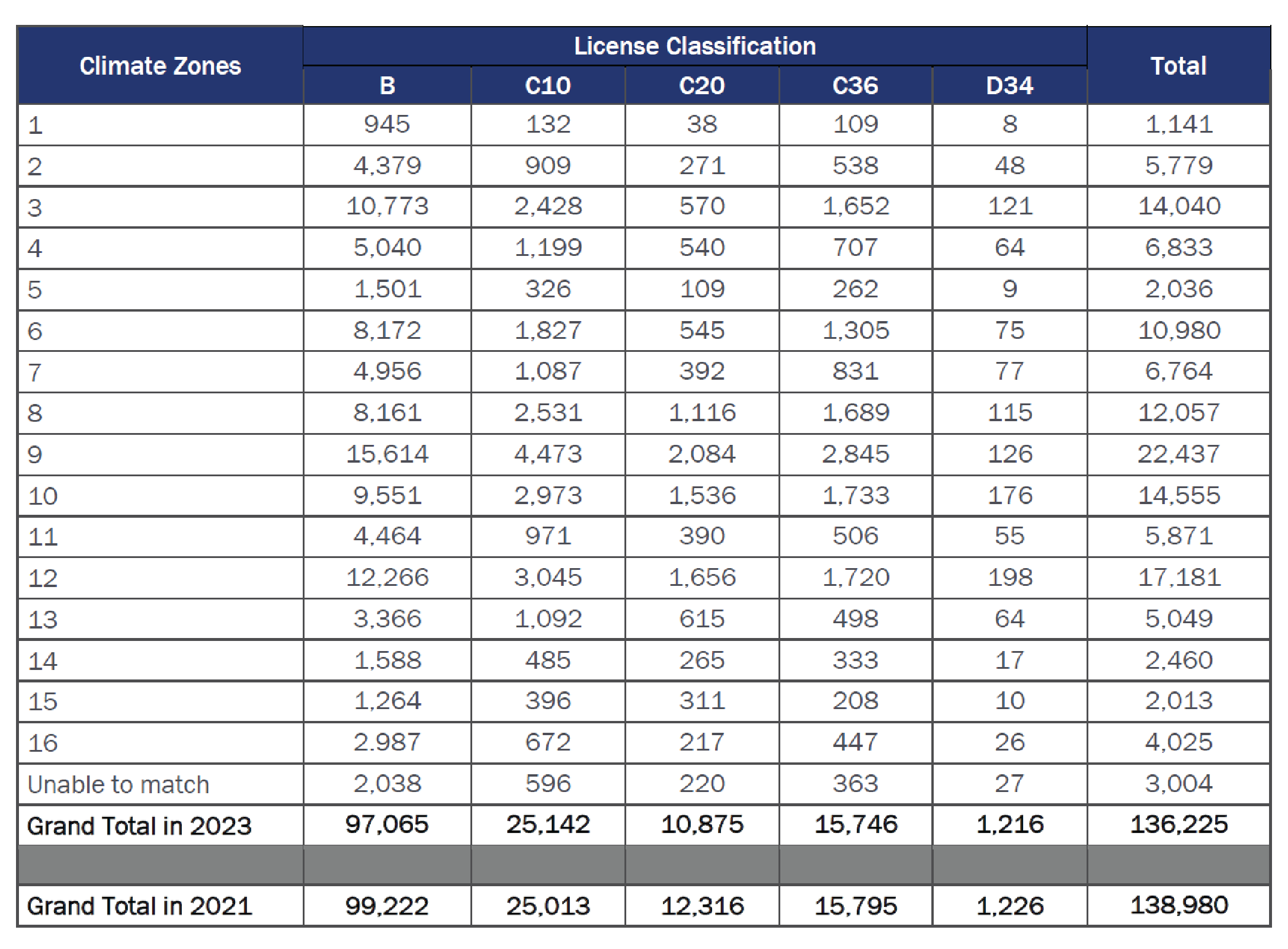 In 2021, a total of 138,980 California contractors held at least one of the five license types shown in Table 21. In 2023, there were 2,755 fewer contractors with these licenses relevant to heat pumps. Most of the reduction is attributed to a decline in C-20 contractors with HVAC licenses and General B contractors.